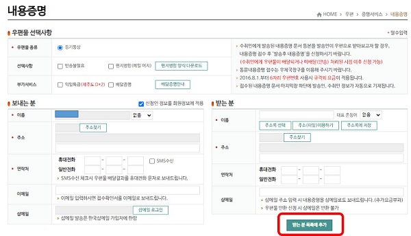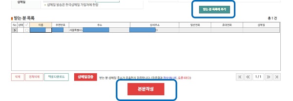 그리고 보 내는 사람과 받는 사람의 정보를 입력하고 하단의 ‘받는분 목록추가’를 클릭하면 1단계는 끝입니다.