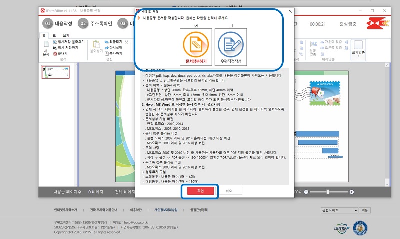 아래와 같이 ‘문서첨부하기’와 ‘우편직접작성’이 뜨고 원하시는 방법을 택1하시면 되요