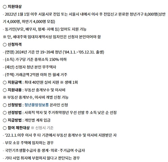 2022년 1월1일 이후 서울시로 이사왔거나 서울시 내에서 이사한 만19 ~ 39세 청년 중에서