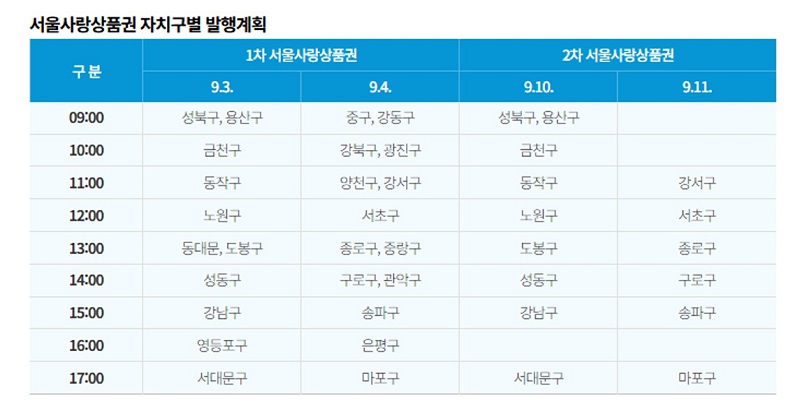 9월 3, 4, 10, 11일, 총 4일간 자치구별로 지역상품권을 살 수 있어요.