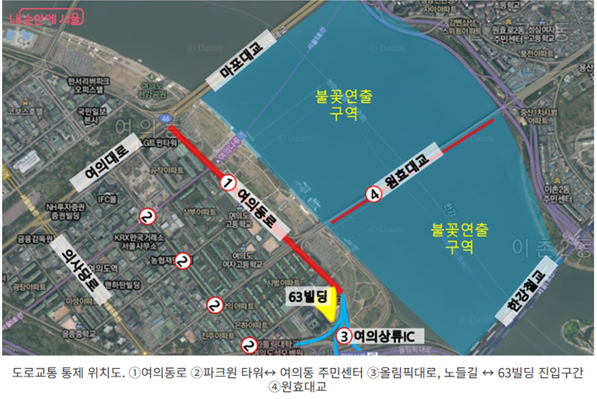 행사 당일인 5일 오후 2시~10시까지 행사장 주변 ‘여의동로(마포대교 남단~63빌딩 앞)’는 전면 통제되고