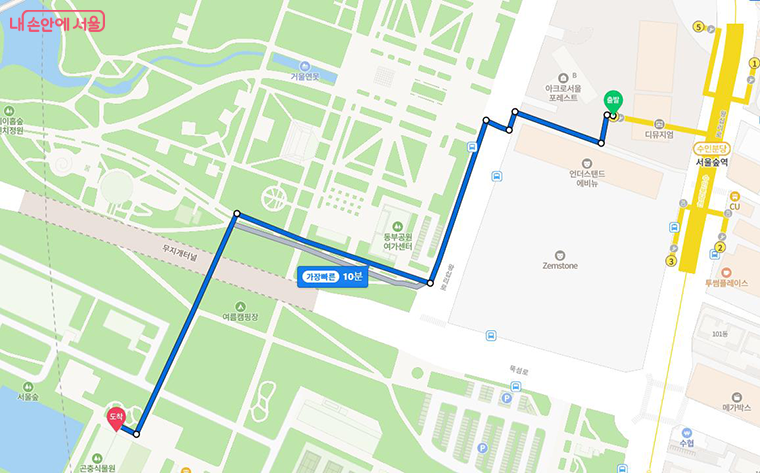수인분당선 서울숲역(4번출구)로 나와 10여 분 정도 도보로 가면 되고