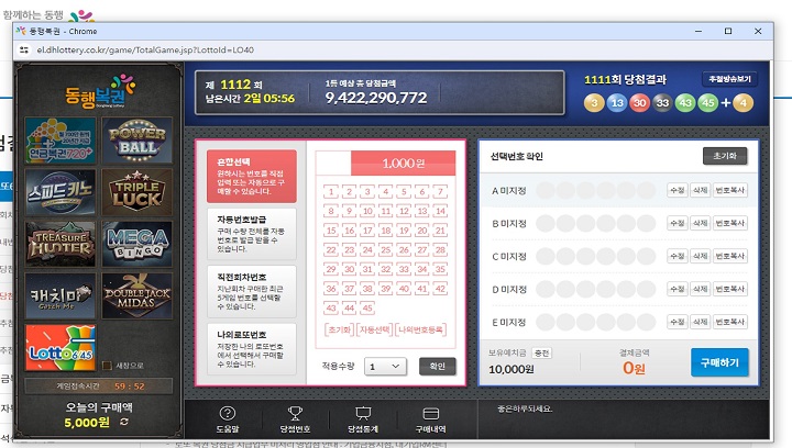 자동번호로 선택하거나 번호 6개를 직접 수동으로 정한 뒤에 구매하시면 됩니다.