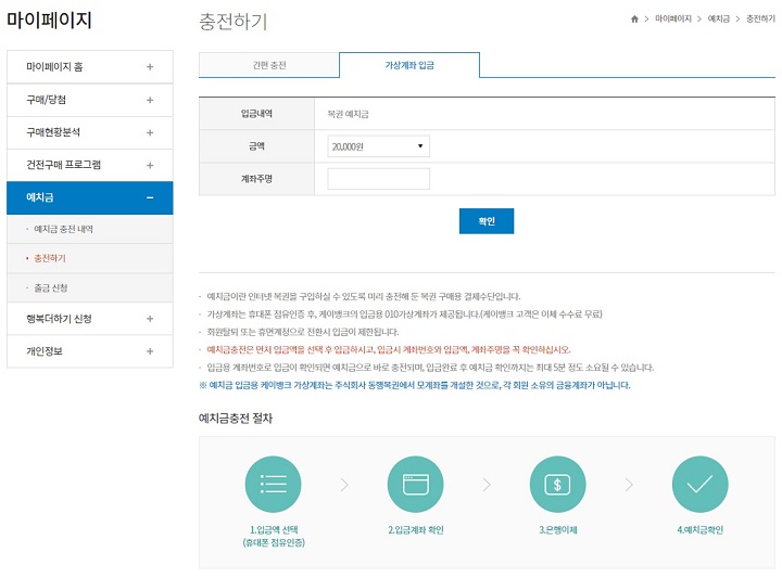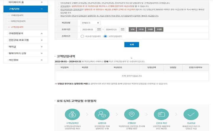 고액 당첨 내역에서 당첨 여부를 확인하고 실명인증하셔야 합니다.