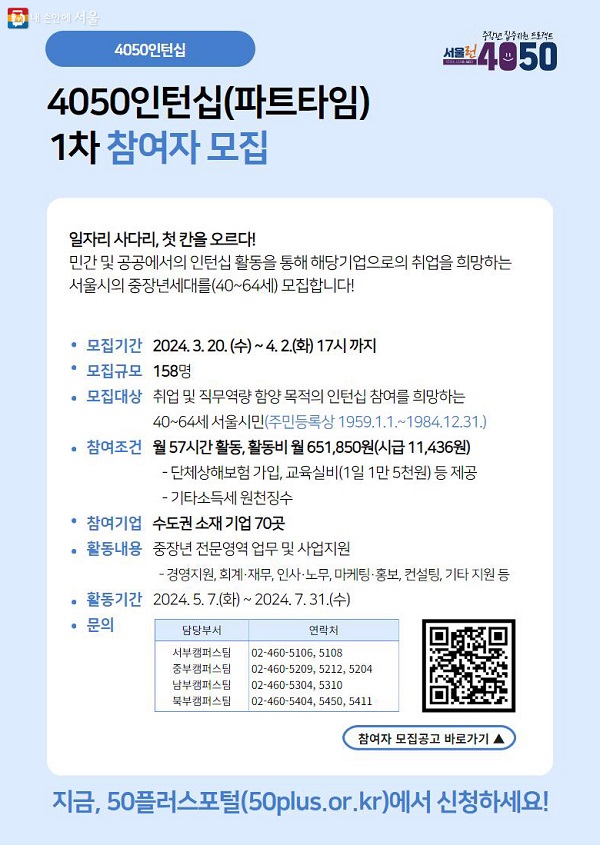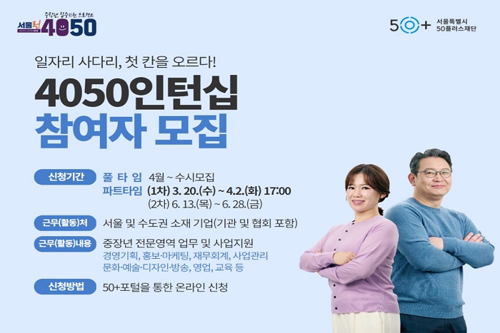 서울시에서 40세 ~ 64세 중장년의 재취업을 지원하는 “4050인턴십” 사업을 운영합니다.