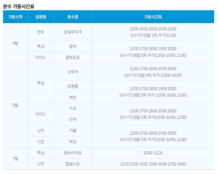 ● 뚝섬한강공원 음악분수, 여의도한강공원 물빛광장분수 도 4. 2.부터 시작합니다.