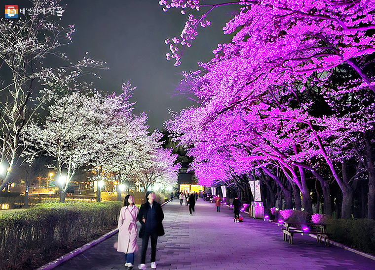 ‘밤벚꽃길’은 23시까지 경관조명이 화려하게 장식되어