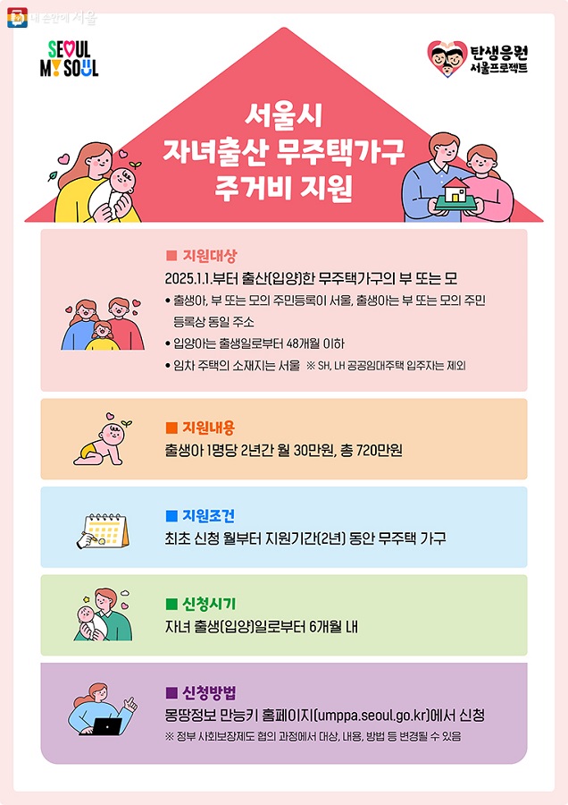 ● 서울에 거주하는 무주택가구이면서 자녀 출산한 가구에 월 30만원을 지원합니다.